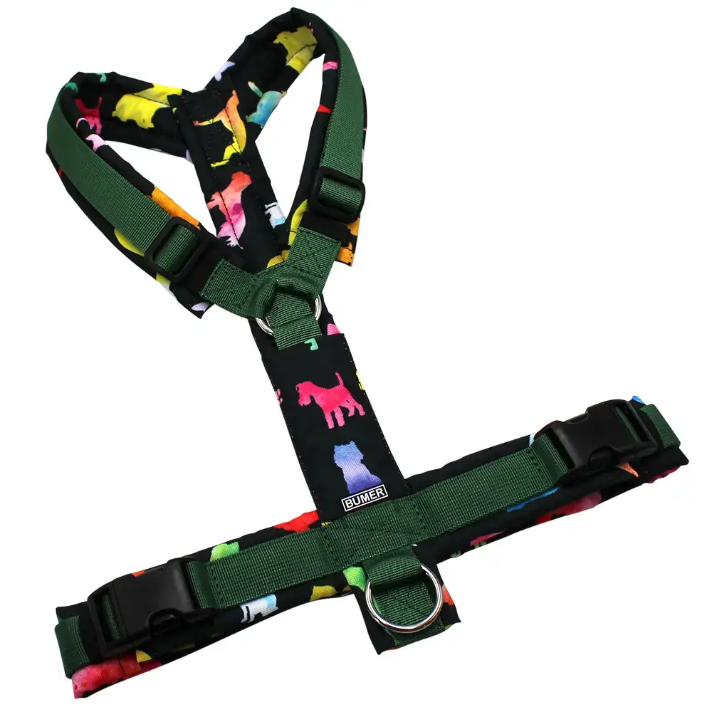 BUMER Hundegeschirr, gepolstert ohne geteilten Bruststeg, Größe L, Gurtband: PREMIUM Evergreen Dream, OXFORD: Bunte Hunde, Ringe: silberfarbig (Edelstahl), Schnallen: schwarz, Applikation