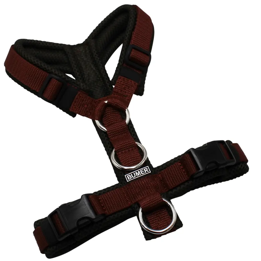 BUMER Hundegeschirr, gepolstert ohne geteilten Bruststeg, Größe XS, Gurtband: Rotbraun, MESH: Olive Braun, Ringe: silberfarbig (Edelstahl), schwarz (DURAFLEX®), Zusatzring