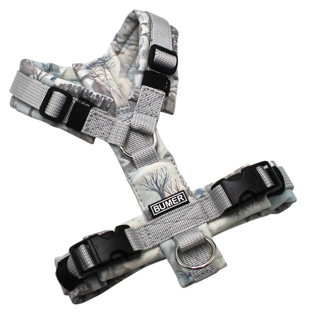 BUMER Hundegeschirr, gepolstert ohne geteilten Bruststeg, Größe XXS, Gurtband: PREMIUM Muschelgrau, Softshell: Frosthügel, Ringe: silberfarbig (Edelstahl), Schnallen: schwarz (DURAFLEX®), Applikation