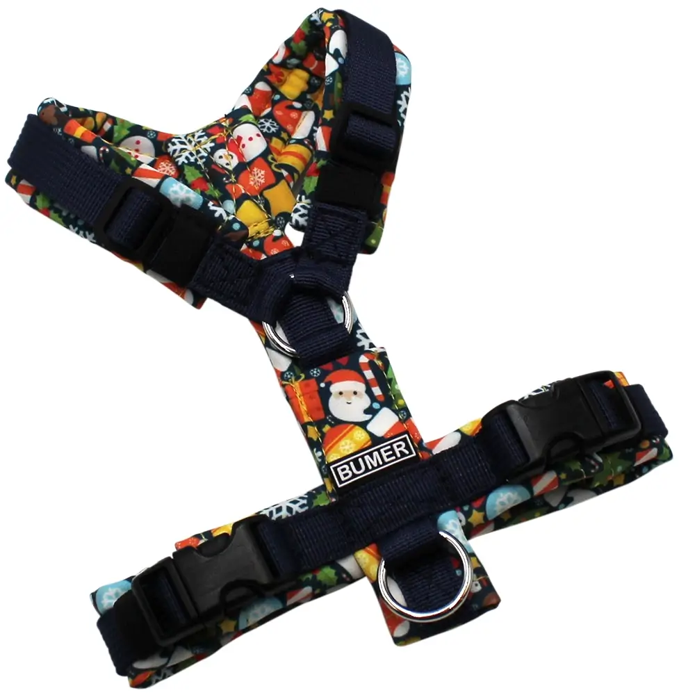 BUMER Hundegeschirr, Gurtband: PREMIUM Midnight Indigo, Softshell: Weihnachten #3, gepolstert ohne geteiltem Bruststeg, Größe XXS, Ringe: silberfarbig (Edelstahl), Schnallen: schwarz (DURAFLEX®), Applikation